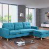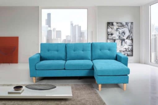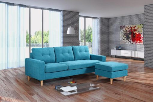 סלון פינתי צעיר ותוסס הכולל ספה תלת מושבית וספה דו-מושבית צידית (שזלונג) מרופדת אריג בד פישתן רחיץ.