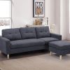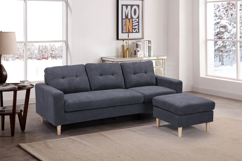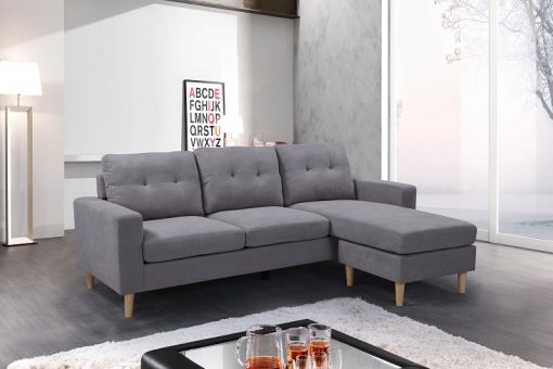 סלון פינתי צעיר ותוסס הכולל ספה תלת מושבית וספה דו-מושבית צידית (שזלונג) מרופדת אריג בד פישתן רחיץ.